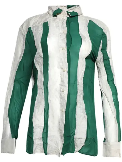 green/white silk chiffon crinkled finish panelled design front button fastening classic collar long sleeves buttoned cuffs asymmetric hem relaxed fit