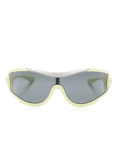 pastel yellow acetate shield frame engraved logo to the front blue tinted lenses Medusa Head motif sculpted arms curved tips These glasses come with a protective case.