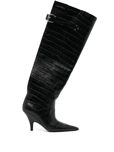 black leather embossed crocodile effect buckle fastening open back embossed logo to the side stud detailing branded insole 100mm stiletto heel