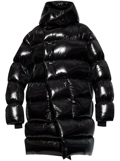 black goose down patent finish padded design quilted classic hood concealed front press-stud fastening long sleeves drop shoulder straight hem