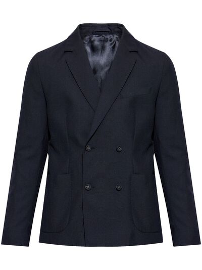 navy blue virgin wool double-breasted button fastening notched lapels two side patch pockets long sleeves straight hem