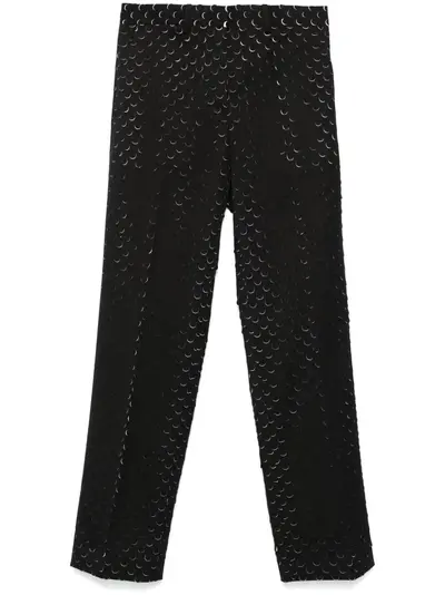 black twill weave concealed front button, hook and zip fastening laser-cut detail pre-drilled holes belt loops pressed crease two diagonal pockets to the sides two rear welt pockets full lining straight leg