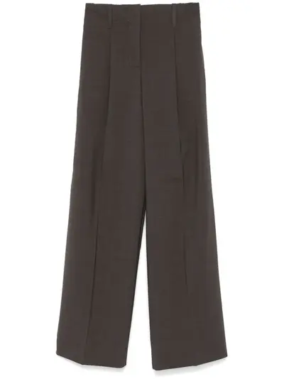 chestnut brown virgin wool-silk blend mélange effect concealed front button, hook and zip fastening belt loops two side inset pockets pressed crease two rear welt pockets tailored cut straight leg