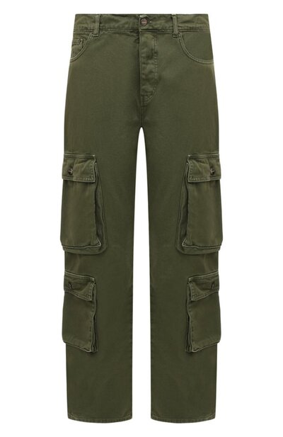 Брюки с завышенной посадкой и вертикальными складками, прошитыми короткими стежками сзади, изготовили из хлопкового твила. Модель с пятью карманами дополнили еще четырьмя карго. Окрашивание изделия в готовом виде придало ему выбеленный оттенок.