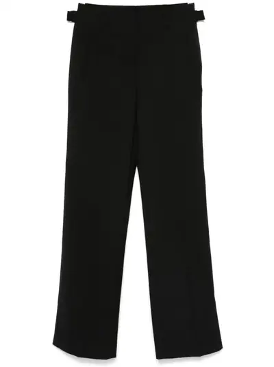 black virgin wool tailored design concealed front button, hook and zip fastening adjustable side straps belt loops pressed crease two side slit pockets rear button-fastening pocket straight leg