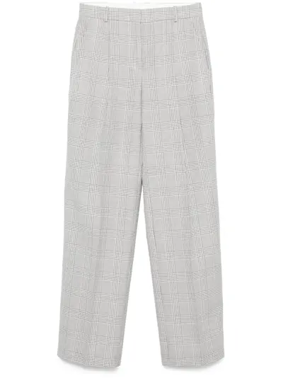 grey/white virgin wool Prince of Wales check pattern pleat detailing belt loops concealed front button, hook and zip fastening two side slit pockets rear welt pocket straight leg