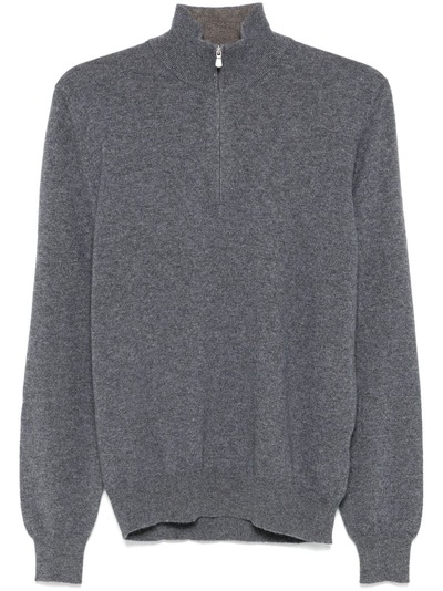 grey cashmere knitted construction half front zip fastening stand-up collar long sleeves ribbed cuffs and hem