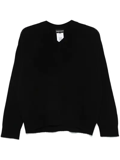 black virgin wool-cashmere blend fine knit ribbed trim V-neck drop shoulder long sleeves straight hem