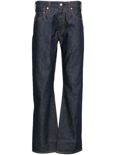 indigo blue cotton denim contrast stitching logo patch to the rear mini logo tag bootcut mid-rise concealed fly and button fastening belt loops classic five pockets straight hem