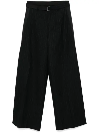 black wool twill weave pinstripe pattern concealed front hook and zip fastening high waist detachable and adjustable waist belt belt loops two side inset pockets pressed crease satin trim dart detailing to the rear two rear button-fastening jetted pockets wide leg