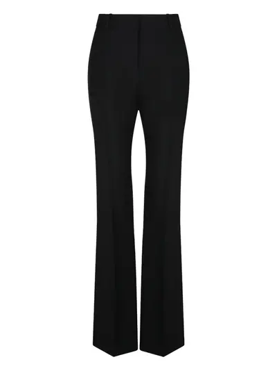 black wool concealed front fastening low-rise belt loops pressed crease two side slash pockets two rear button-fastening jetted pockets straight leg