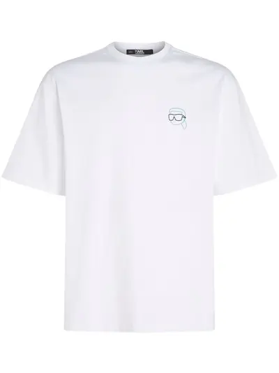 white organic cotton round neck short sleeves signature Mini Ikonik Karl applique logo print to the rear straight hem This item is made from at least 50% organic materials. Learn more about what makes a product Conscious on our Conscious Criteria page