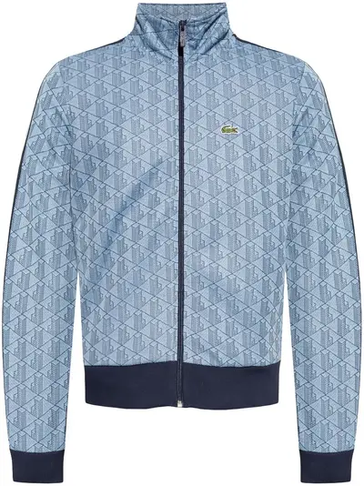 blue monogram pattern embroidered logo at the chest front zip fastening mock neck side stripe detailing two side inset pockets long sleeves ribbed cuffs and hem straight hem