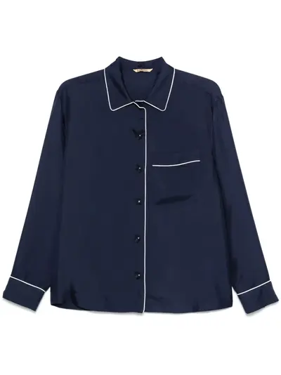 navy blue silk satin finish piped-trim detailing front button fastening classic collar long sleeves buttoned-cuff sleeves chest patch pocket straight hem