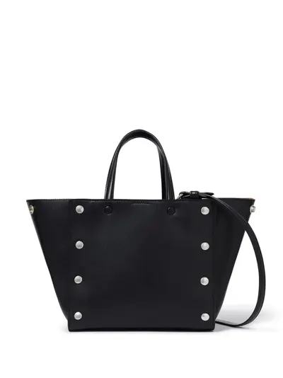 black faux leather magnetic fastening two top handles detachable shoulder strap stud embellishment main compartment full lining removable pouch