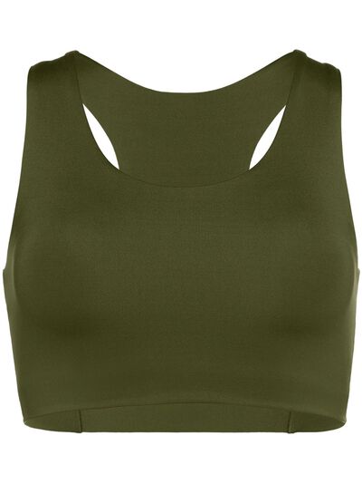 khaki stretch-design embroidered logo to the rear scoop neck elasticated underband sleeveless racerback open back cropped full lining