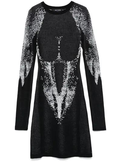 black/white knitted construction skull jacquard motif crew neck long sleeves ribbed cuffs and hem bodycon design straight hem thigh-length