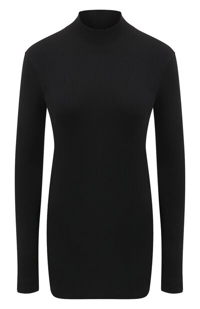 Лаконичная водолазка органично дополнит образ в темной гамме с брюками и ботильонами. Для пошива облегающей модели использовали хлопковый трикотаж в рубчик. Сзади под горловиной изделие украсили знаковой для марки цепочкой мониль.