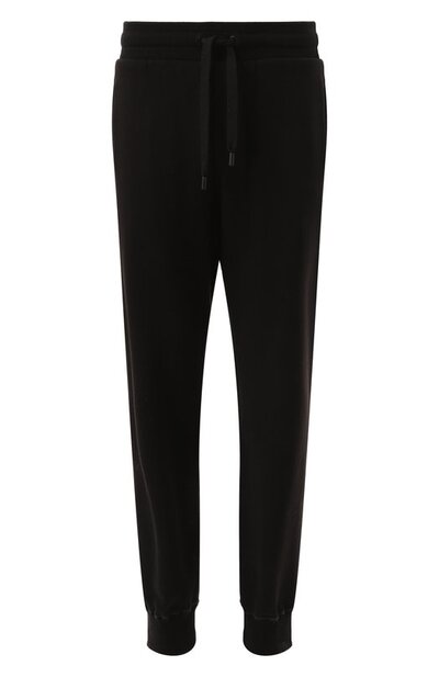 Джоггеры из хлопкового трикотажа дополнили широким поясом-кулиской и тремя карманами — втачными боковыми и задним на молнии. На нем расположили крупный брендированный патч, имитирующий фирменную гравированную пластину.