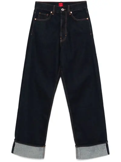 indigo blue cotton denim concealed fly and button fastening high-rise contrast stitching belt loops classic five pockets logo patch to the rear turn-up hem straight leg