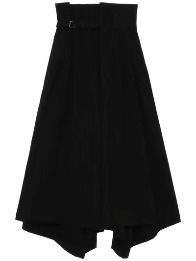 black wool-silk blend pinstripe pattern asymmetric hem belted waist two side inset pockets rear patch pocket high-rise wide leg cropped leg