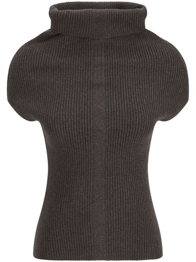 dust brown recycled cashmere wool blend knitted construction mock neck drop armholes ribbed hem unlined