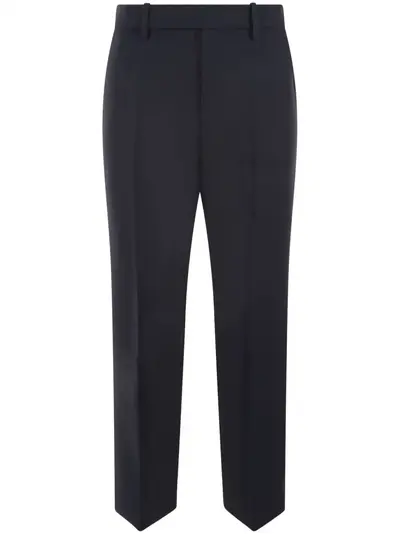 midnight blue wool blend pressed crease belt loops concealed front fastening two side slash pockets two rear welt pockets straight leg unlined