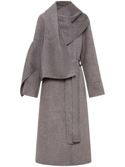 charcoal grey wool blend belted waist attached shawl notched lapels long raglan sleeves belt loops two side slit pockets central rear vent straight hem mid-calf length
