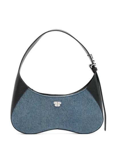 indigo blue/black cotton calf leather washed denim contrasting panel detail top zip fastening adjustable top handle embroidered logo to the front silver-tone logo plaque main compartment