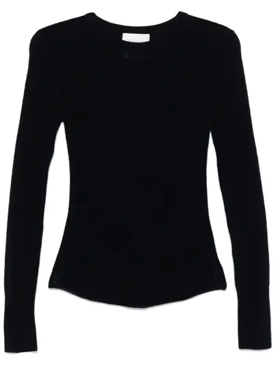 navy blue wool-cashmere blend fine knit brushed effect crew neck long sleeves ribbed cuffs curved hem