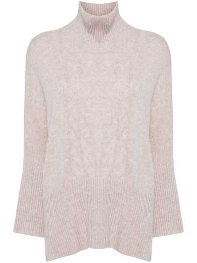 sand brown organic cashmere knitted construction cable knit mock neck ribbed trim long sleeves straight hem