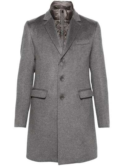 slate grey cashmere brushed effect layered design front button fastening front two-way zip fastening detachable padded panels stand-up collar notched lapels long sleeves with buttoned cuffs chest welt pocket dart detailing two front flap pockets internal zip-fastening pocket internal slip pocket full quilted lining straight hem thigh-length