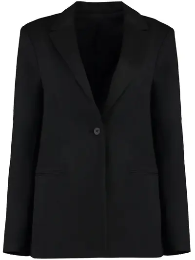 black crepe texture front button fastening notched lapels shoulder pads long sleeves with split cuffs two front jetted pockets American rear vent full lining straight hem