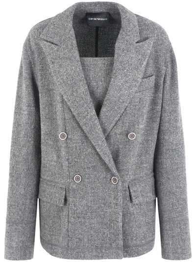 ash grey virgin wool blend mélange effect vertical seamed peak lapels double-breasted button fastening long sleeves chest welt pocket two side flap pockets straight hem