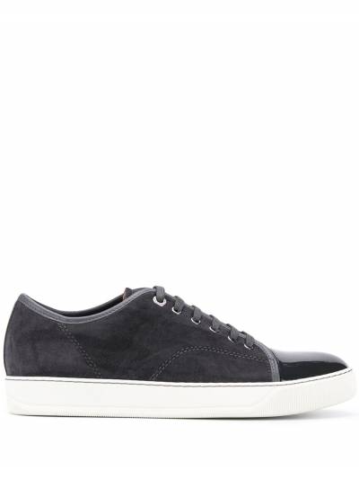 Renowned for their impeccable quality, timeless styling and strong detail-oriented aesthetic, Parisian fashion house Lanvin presents these grey velvet sneakers. Featuring a lace-up front fastening, a white rubber sole and a contrasting patent leather toecap.