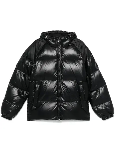 black duck down padded design high-shine detailing water-repellent windproof front two-way zip fastening drawstring hood long raglan sleeves elasticated cuffs two side welt pockets straight hem full lining When buying this unisex item, keep in mind that it is graded in standard men's sizing.