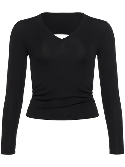 black silk blend fine ribbed embroidered logo to the rear gathered detailing V-neck long sleeves open back cropped