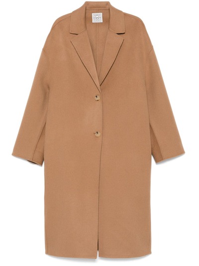 camel brown wool brushed effect front button fastening notched lapels drop shoulder long sleeves two side slit pockets straight hem mid-length
