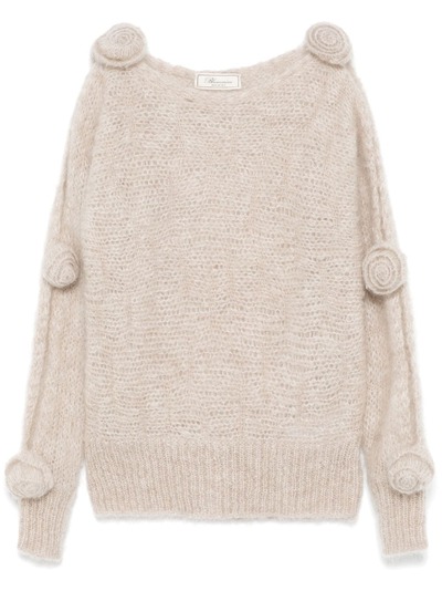 beige mohair blend open knit brushed effect floral appliqué cold-shoulder design round neck long sleeves ribbed cuffs and hem straight hem