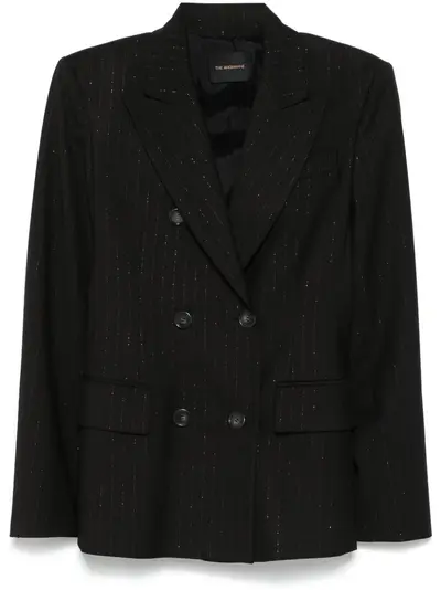 black textured finish pinstripe pattern double-breasted button fastening peak lapels shoulder pads long sleeves buttoned cuffs chest welt pocket two side flap pockets full lining straight hem