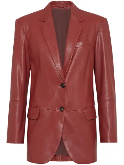 ruby red leather front button fastening notched lapels chest welt pocket two front flap pockets long sleeves buttoned-cuff sleeves curved hem