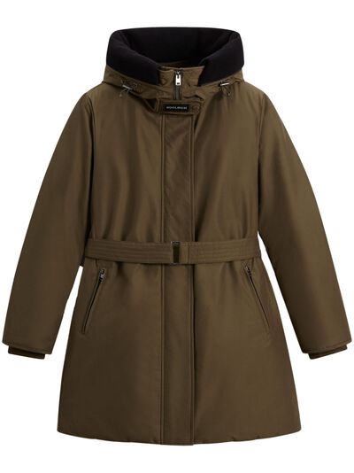 brown cotton blend duck down front press-stud and zip fastening stand-up collar classic hood belted waist long sleeves ribbed cuffs two side zip-fastening pockets internal slip pocket straight hem