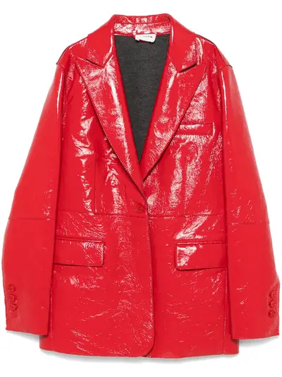 red lambskin patent finish front button fastening peak lapels long sleeves buttoned cuffs chest welt pocket two side flap pockets central rear vent