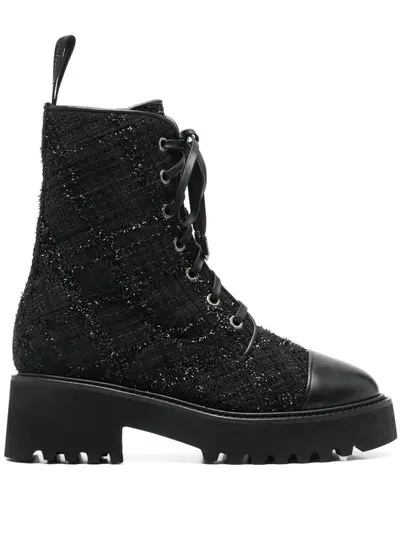black bouclé construction front lace-up fastening side zip fastening 50mm block heel pull-tab at the heel tonal leather toecap round toe chunky rubber lug sole