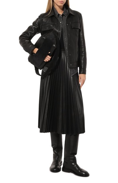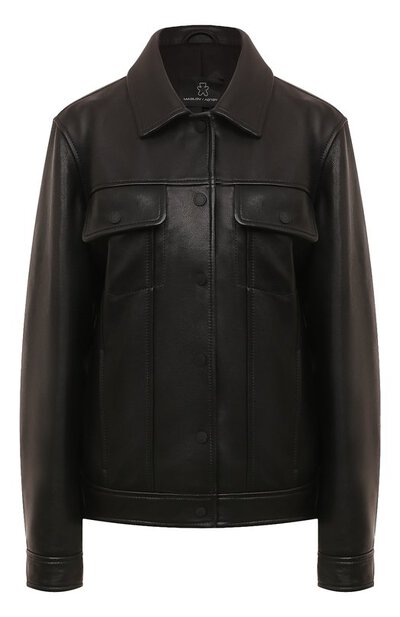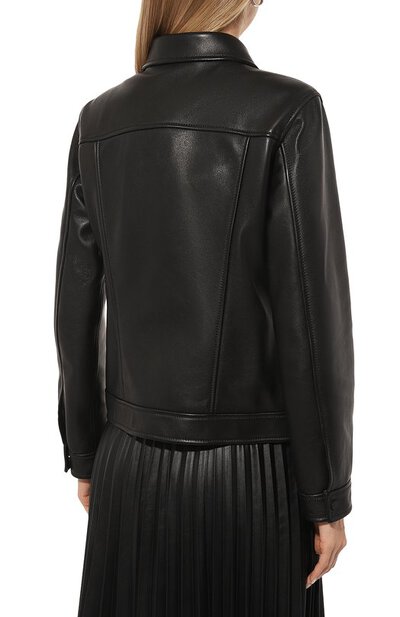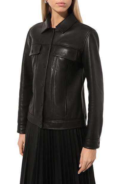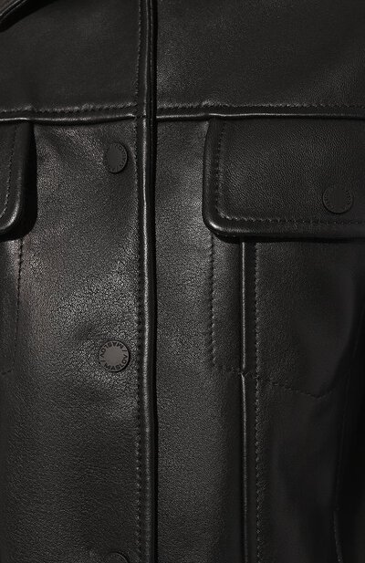 Куртку из мелкозернистой кожи дополнили двумя нагрудными и парой прорезных боковых карманов. Модель с шелковым подкладом застегивается брендированными кнопками в тон.