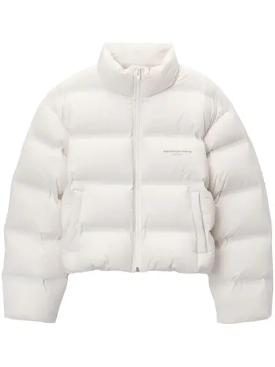white down-feather filling padded design front zip fastening high neck long sleeves logo print to the side reflective detailing two side welt pockets straight hem cropped