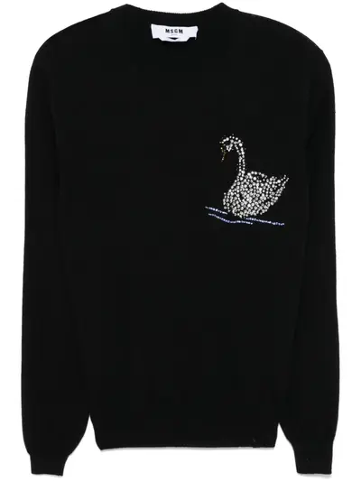 black fine knit crystal embellished swan appliqué crew neck long sleeves ribbed cuffs and hem