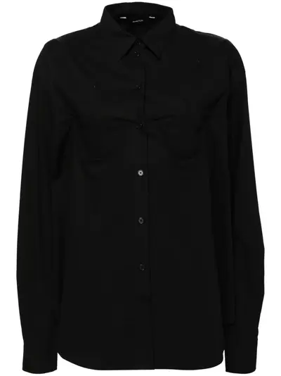 black cotton front button fastening classic collar wire at cups buttoned cuffs curved hem