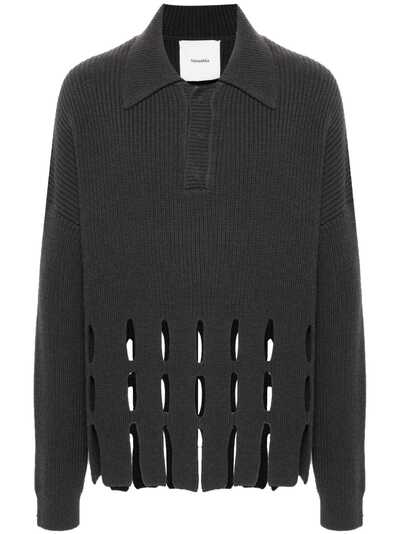 anthracite grey wool-cashmere blend knitted construction ribbed knit concealed half press-stud fastening polo collar drop shoulder long sleeves ribbed cuffs and hem cut-out detailing asymmetric hem