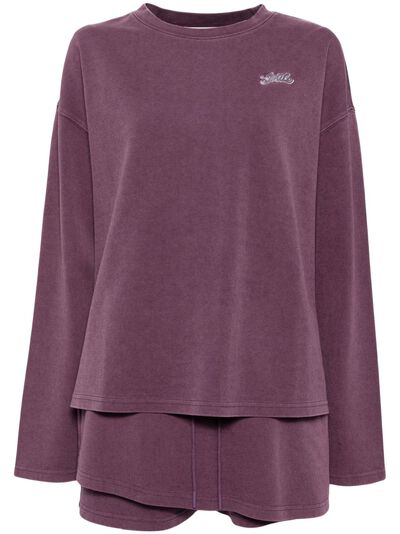 dark purple cotton blend jersey texture garment dyed Top crew neck long sleeves appliqué logo drop shoulder long sleeves slogan print to the rear straight hem Shorts double layer elasticated drawstring waistband two side welt pockets thigh-length